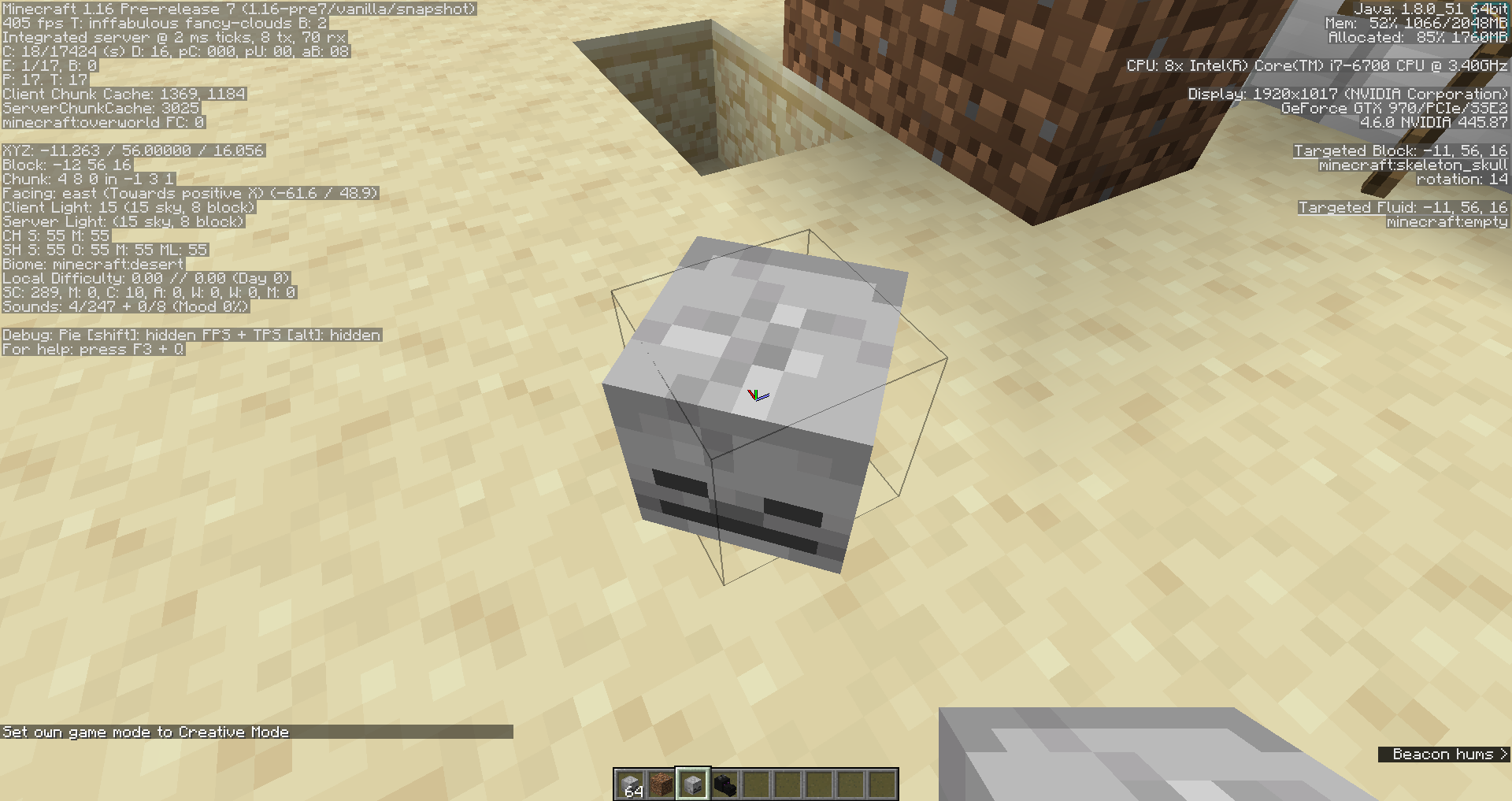 If we place a partially rotated skull or head, and look at its hitbox, we see that depending on the viewing angle, its hitbox disappears partially. It doesn't matter if you use "Fast", "Fancy", or "Fabulous!" graphics settings.