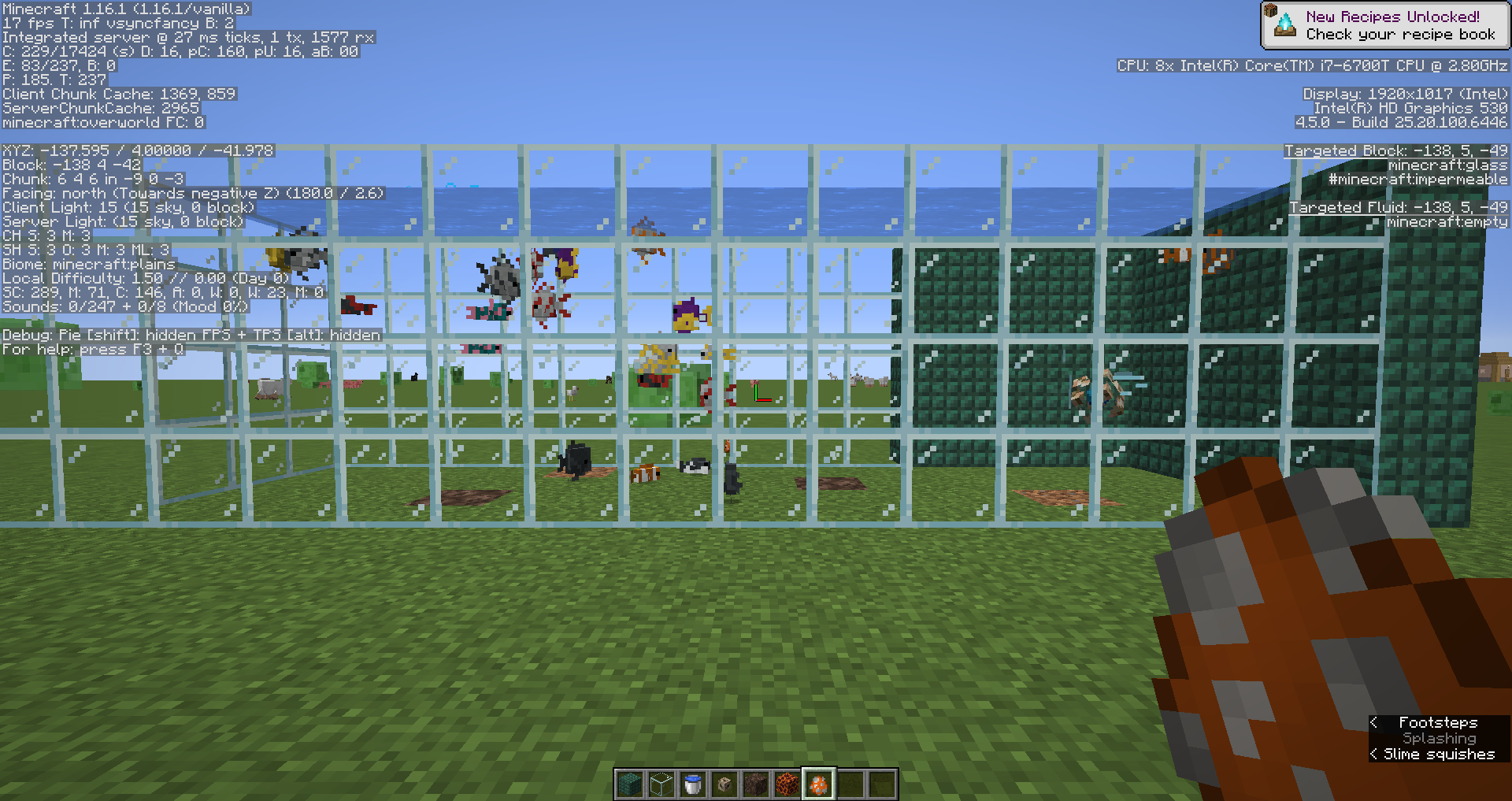 If you put water behind glass blocks and there are no spaces between the water and glass blocks, it will look like there is no water. You will still see fish swimming around, bubbles from water elevators, and conduits turning but looks like it is gone.