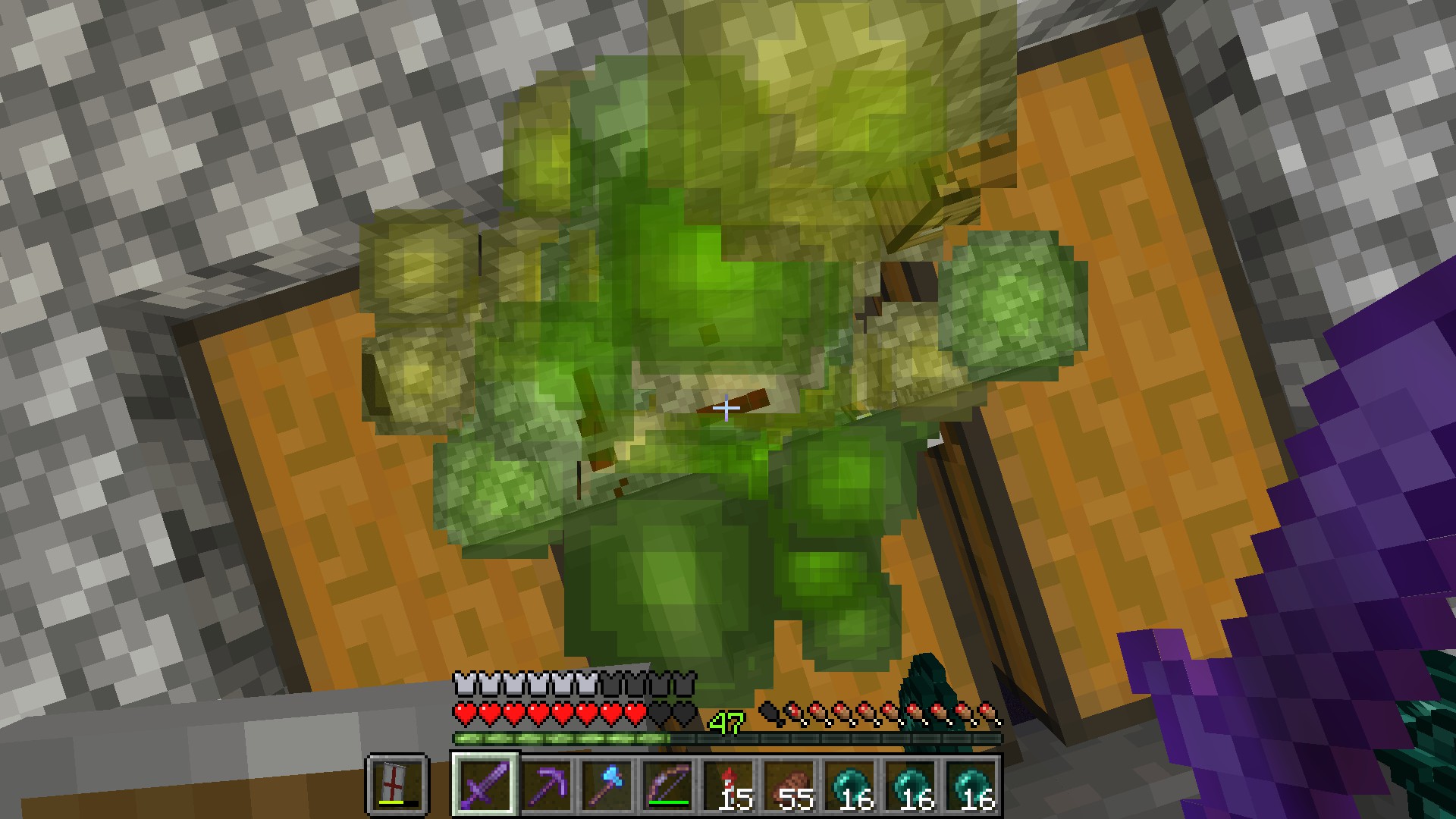 When a certain number of EXP orbs are on the ground, instead of the player absorbing them all at once, they slowly get absorbed as they orbit the player. This feature has been in the game for a while, but something I've noticed is that if the player looks at the EXP orbs before they get absorbed, they can see through chests. I haven't tested this with other blocks but it seems to not affect full blocks, such as cobblestone.