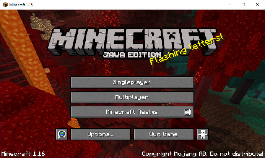 The menu screen of Minecraft reads "Copyright Mojang AB. Do not distribute!" instead of "Copyright Mojang Studios. Do not distribute!"
