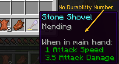 Usually when an item in Minecraft had durability, a bar is shown under that item which goes down and turns a darker color as you lose durability. In addition, there is usually a number shown as ?/? in your inventory when you hover your cursor over the item. This can also be fixed by mending when you gain experience points.