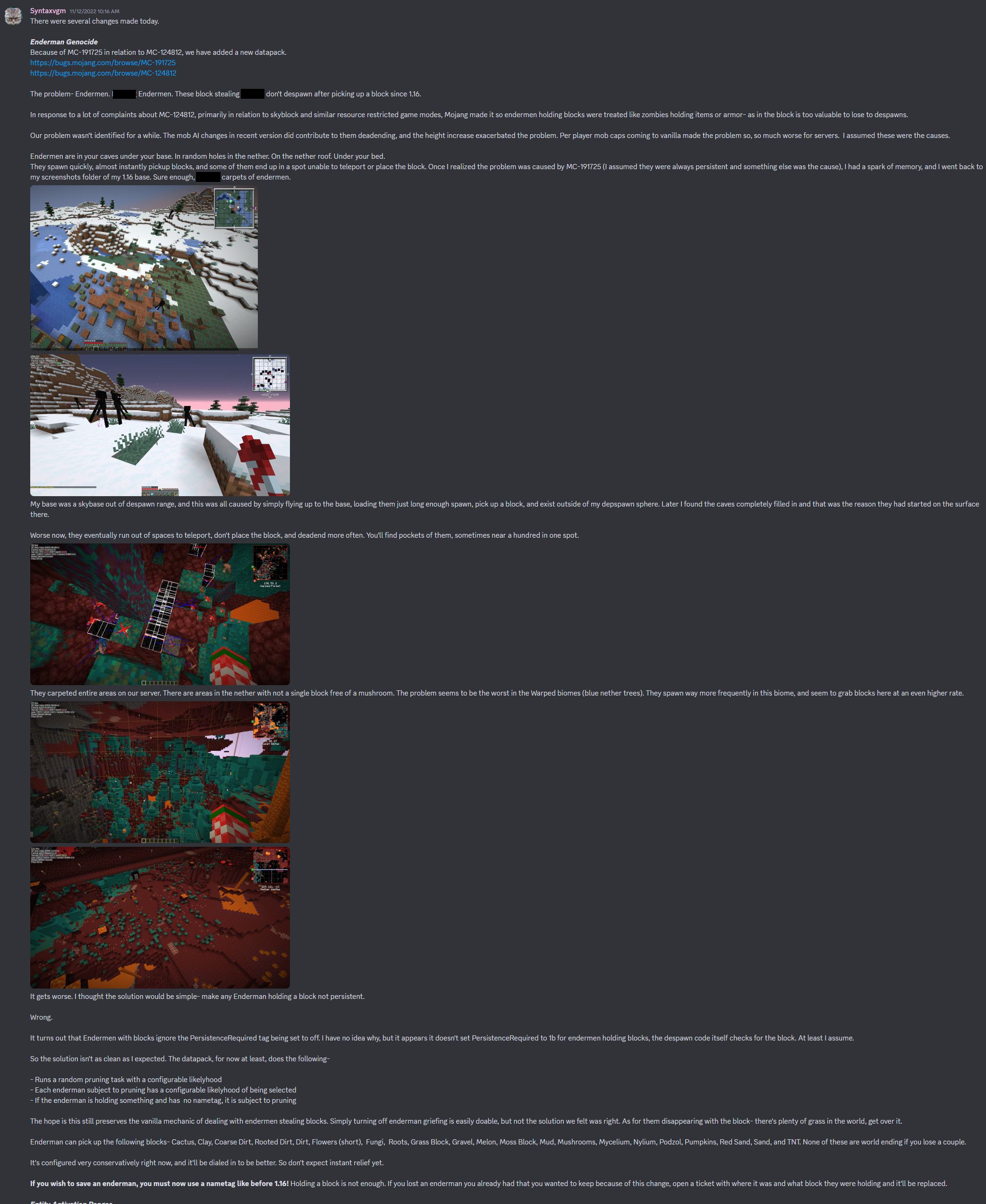 In terms of performance impact, enderman picking up blocks are a huge issue. What often happens is that,