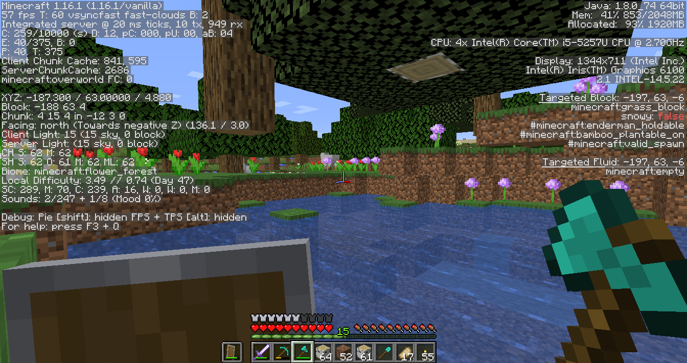 I encountered this bug in previous snapshots. I started a world in 20w17a and encountered the bug after 20w20a. I figured the bug would be fixed, but after starting a new world in 1.16, I encountered the same bug in around the same spot in a flower forest biome. The seed is -1881547168, coordinates in screenshot.