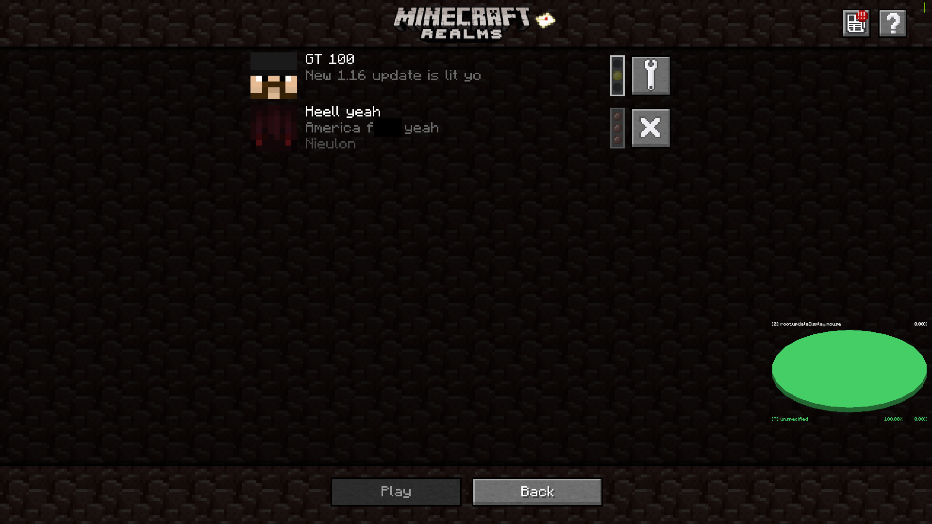 This bug is quite minor so I won't drone on about it, while being in a realm, if you open the debug screen and then leave the realm, the rest of the F3 screen will hide while the actual debug part is still visible. When you then rejoin again the F3 screen will be showing again so I guess it has something to do with that?