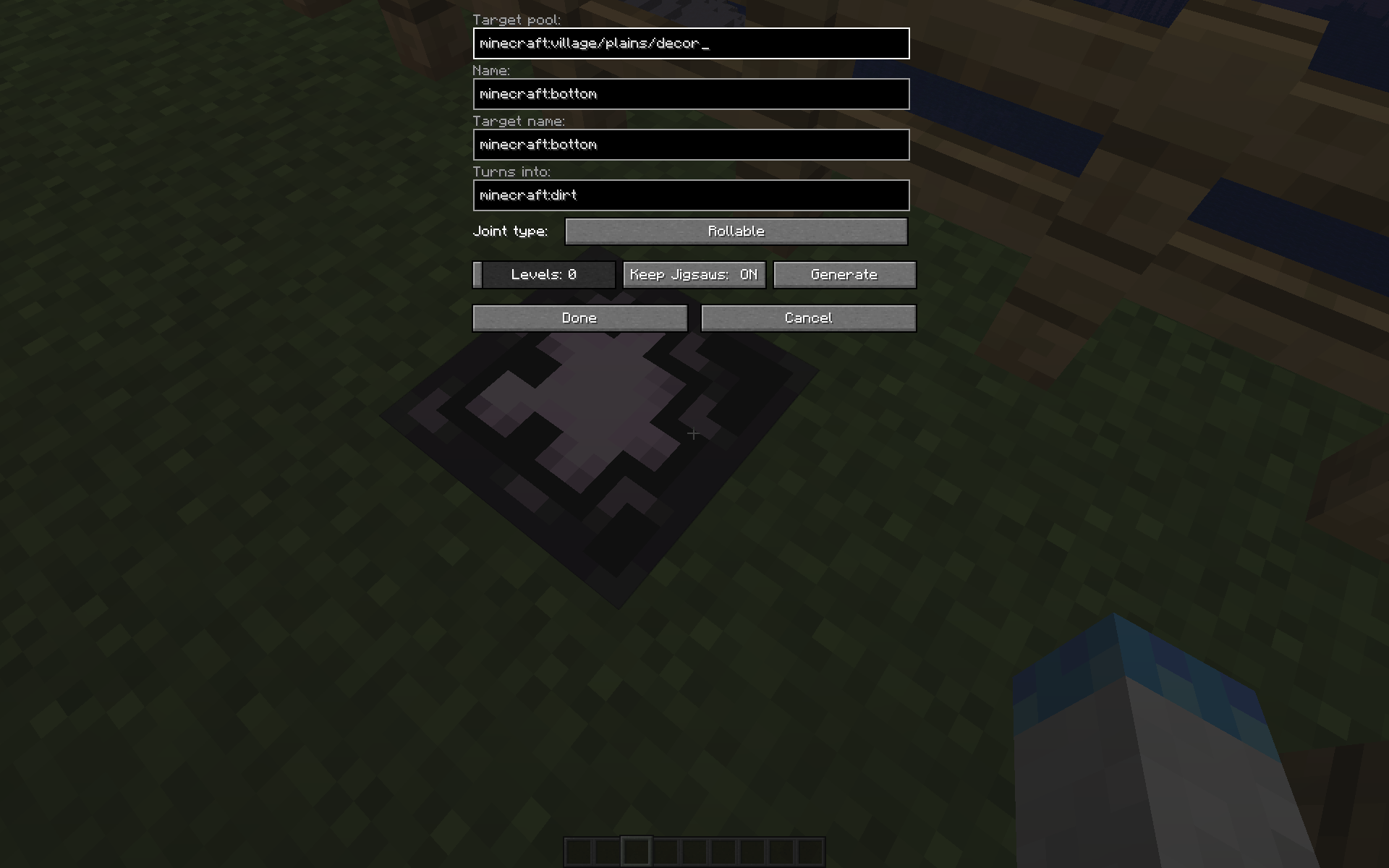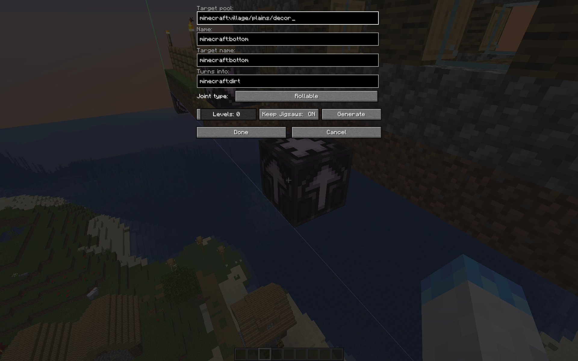 The jigsaw blocks within village/plains/houses/plains_stable_1 are set to minecraft:dirt despite the ground being minecraft:grass_blocks.