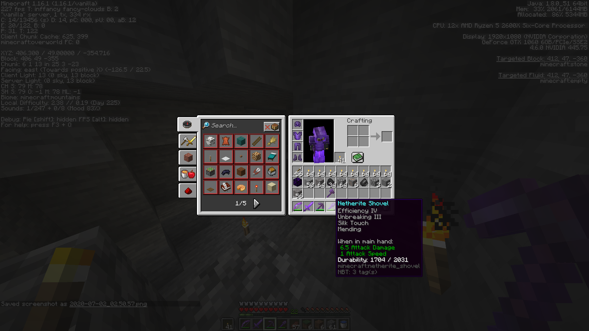 In the screenshots I have provided, the only item with silk touch on it was the shovel, and I can guarantee all I brought with me were my tools, food, and torches. I didn't switch to my pickaxe at all, not even for the briefest second possible.