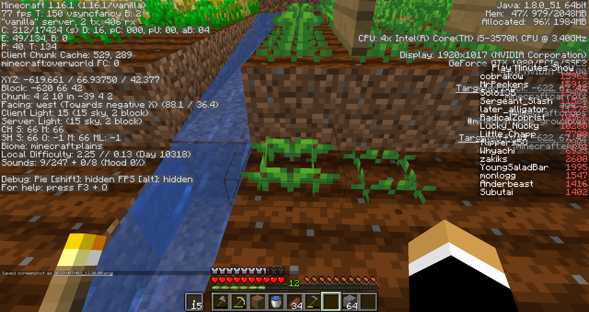 When you have a sidebar with many items on it and the debug screen is opened, the layering of text is inconsistent. As per MC-62997, the overlapping is by design (though I think this should be reconsidered as there is now useful information on the right side - for example, an opacity slider like for chat but for the sidebar). However, parts of the debug text appears above or below the scoreboard text. If the overlapping is intentional, either the debug or sidebar should clearly be in the front.