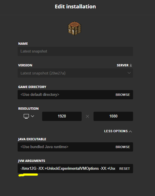 1. In the Minecraft launcher, go to Installations > [Any installation] > Edit > More Options > JVM Arguments