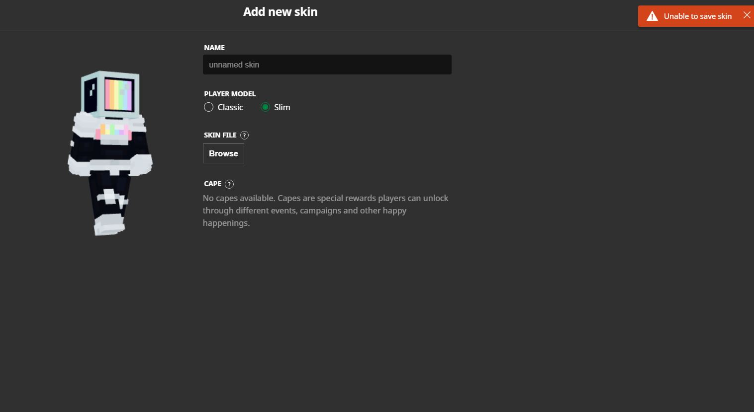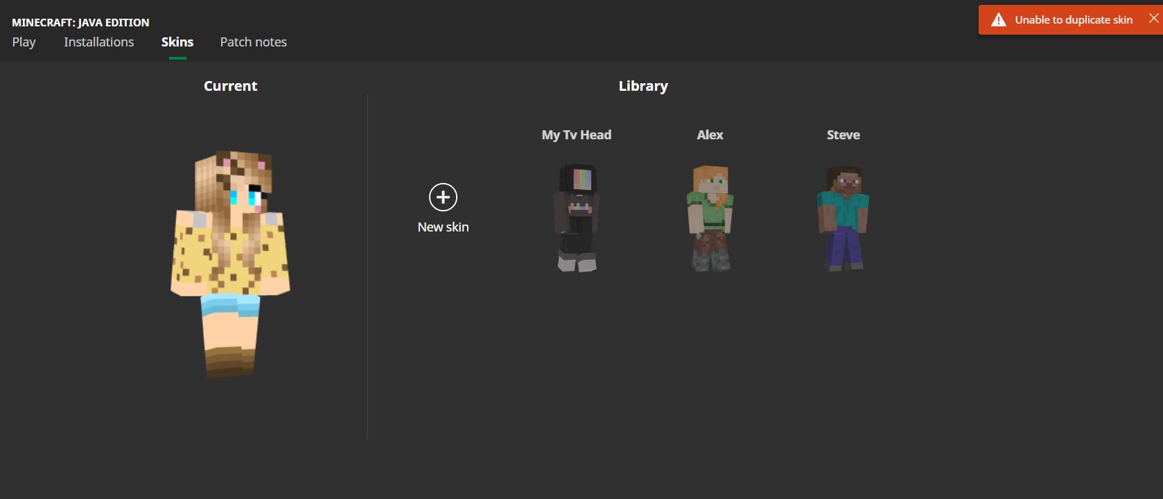 I cannot download new skins, and/or duplicate existing skins (both classic and slim). I tried deleting then downloading the game again, but it didn't work. It doesn't affect my game play, but it does become annoying when I want to change the way my avatar looks.