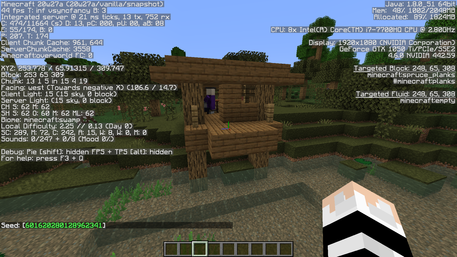 Mobs that used to not spawn in a witch hut now do. The witch farm that I have used since 1.15 now spawns mobs other than witches in this current snapshot. Witches still spawn, but very rarely. I do not know if this is due to passive witch spawning or if it is from the witch hut. The screenshots show that there is a witch hut in a new world at the same position. The other screenshots are of the issue.