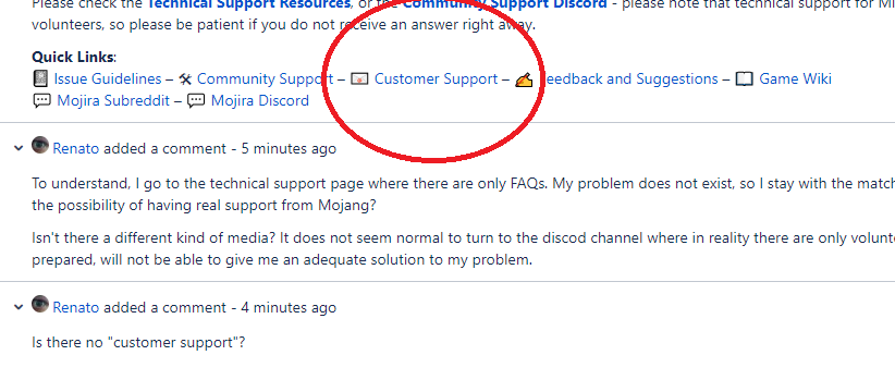 To understand, I go to the technical support page where there are only FAQs. My problem does not exist, so I stay with the match lit in my hand without the possibility of having real support from Mojang?