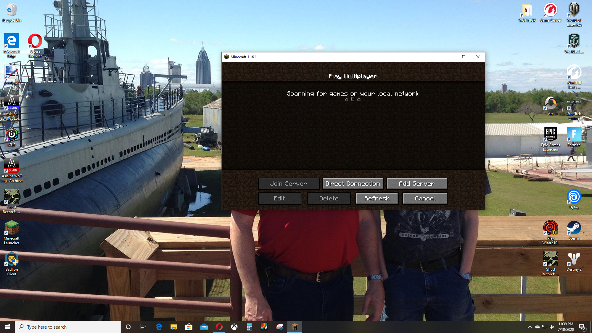 I'm unable to play Multiplayer in Minecraft. I select Multiplayer and all the screen displays is "scanning for games on your local network" and it just stays there. I'm using a new PC with WIN10 and have installed the latest java but game still hangs at multiplayer screen. My old PC is also WIN10 with java and has no problem launching the game. It's like my new PC isn't recognizing Java. Any ideas because I really enjoy playing this with my Son.