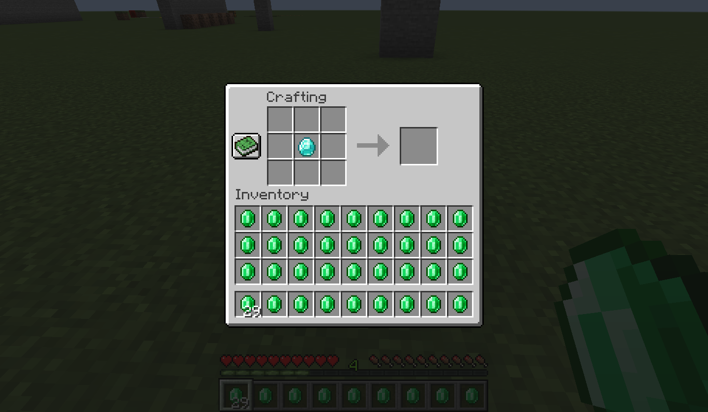 Place down a crafting table, obtain a stack of emeralds, and a singular diamond.