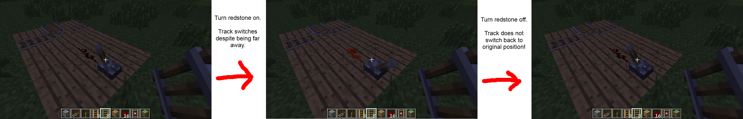 Furthermore, the redstone only changes the junction's direction once. Toggling the redstone power will not continue to affect the track after the direction has already been changed. (See attached image.)