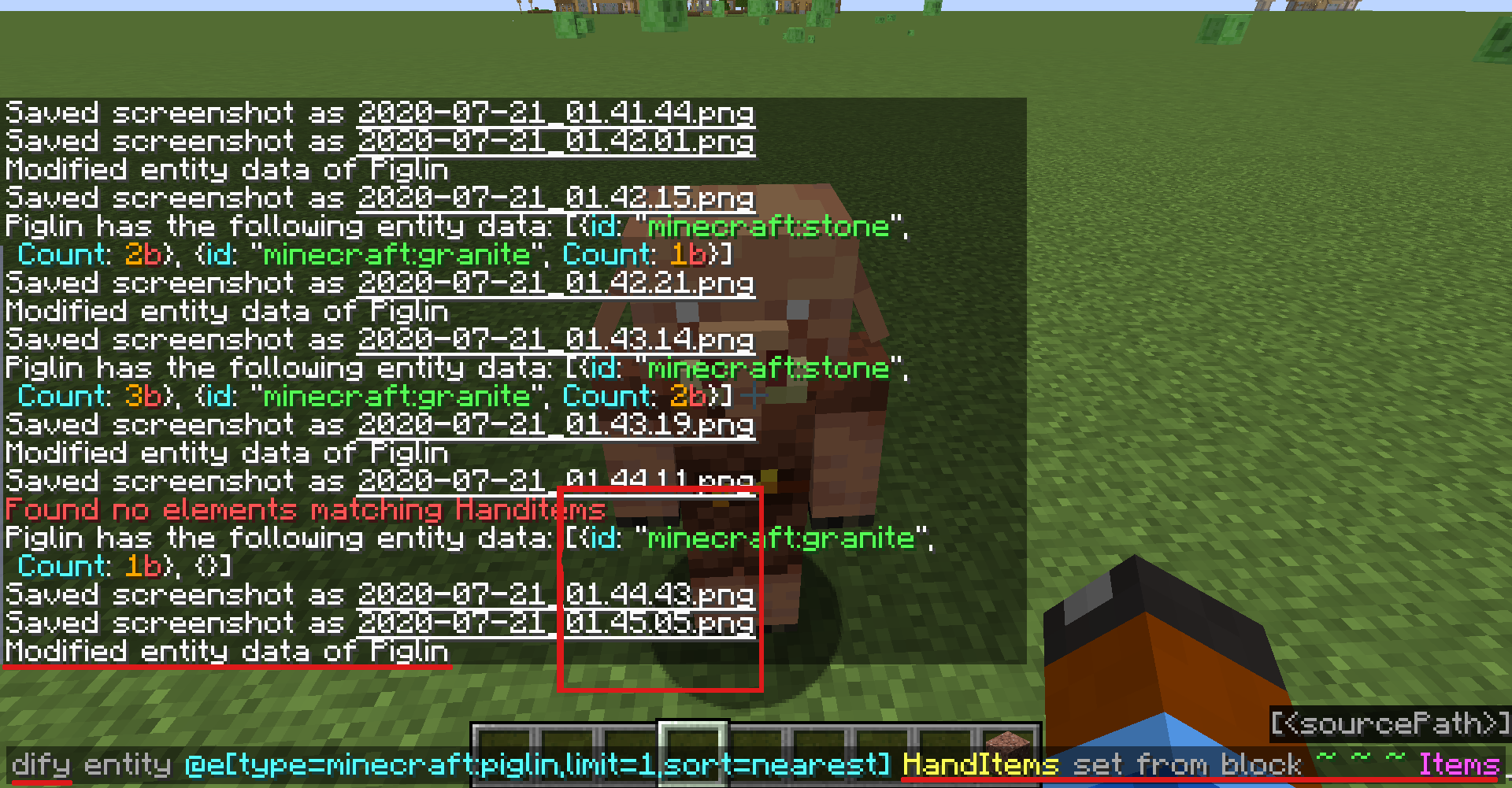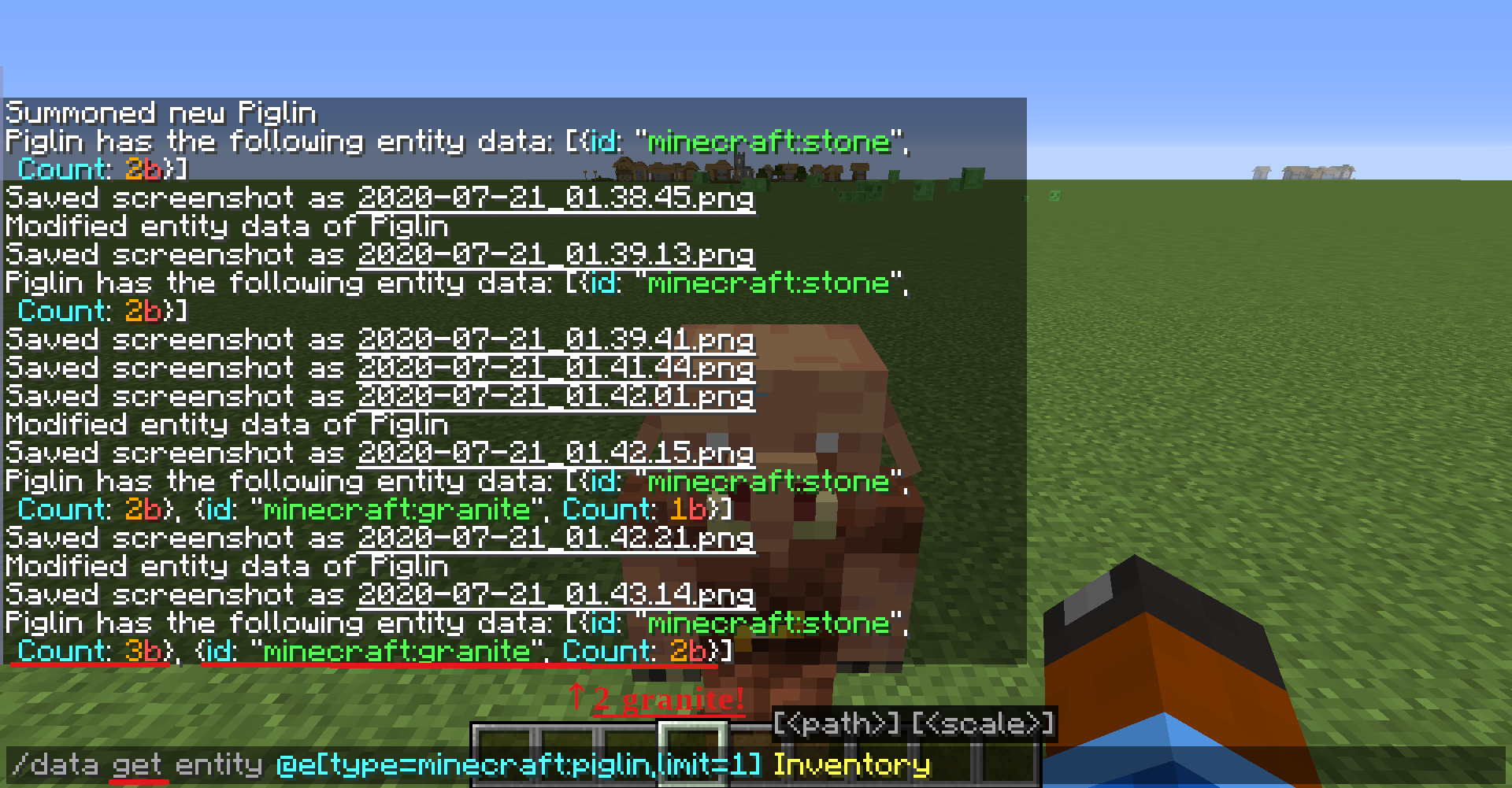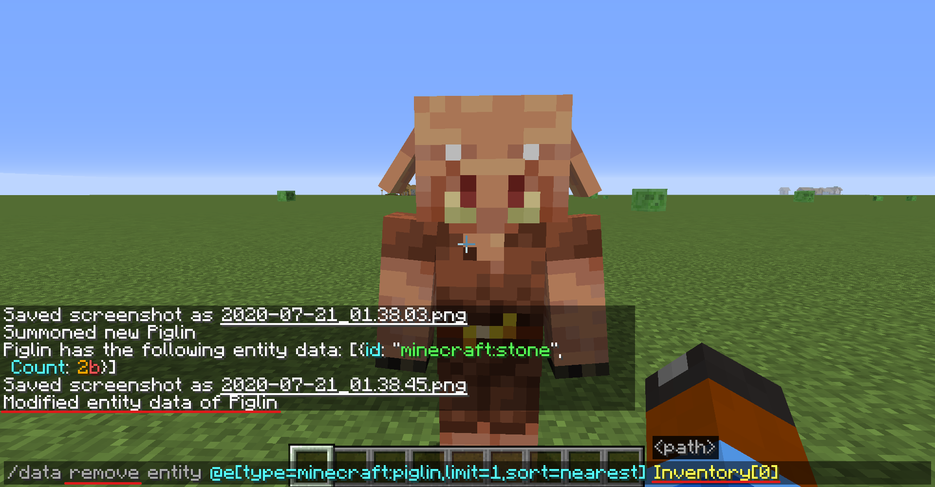 /data get entity @e[type=minecraft:piglin,limit=1,sort=nearest] Inventory❌ We get the feedback "Piglin has the following entity data: [{id: "minecraft:stone",Count: 2b}]"