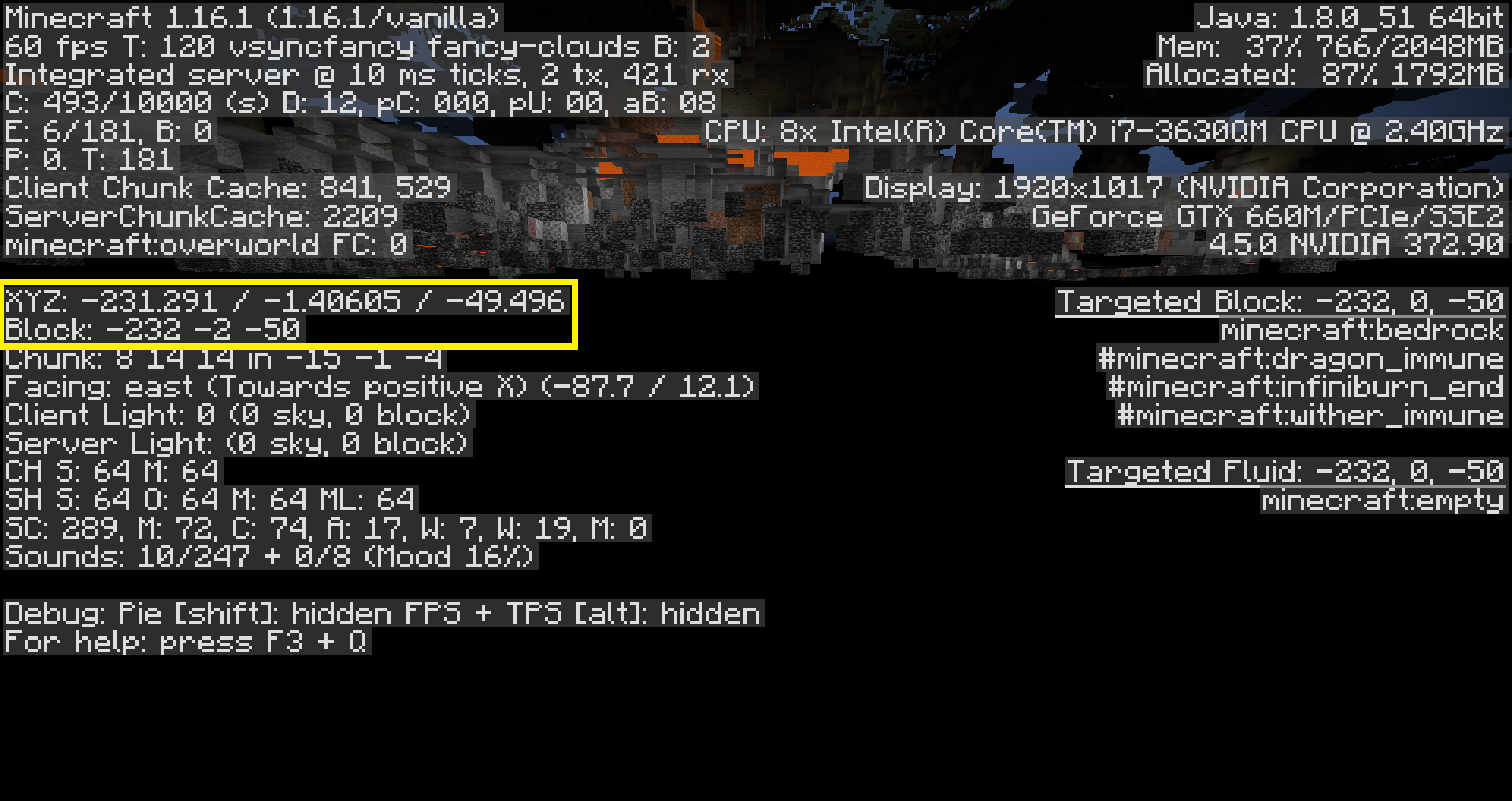 The coordinates of the block the player's feet are in, in xyz format. Similar to XYZ as above, floored to the whole number.
