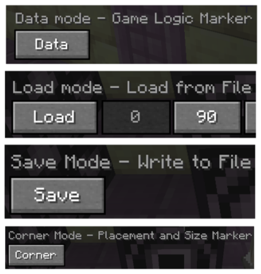 /setblock ~1 ~ ~1 minecraft:structure_block[mode=load]Open each of them and locate the "Data mode" and "Load mode" texts.
