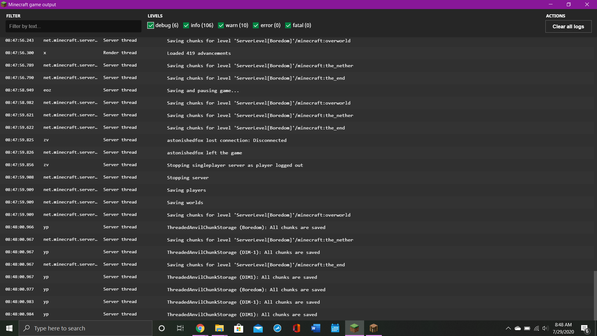 ok so it happened again but with my survival world Boredom and i posted the end of the log when my world disappeared.