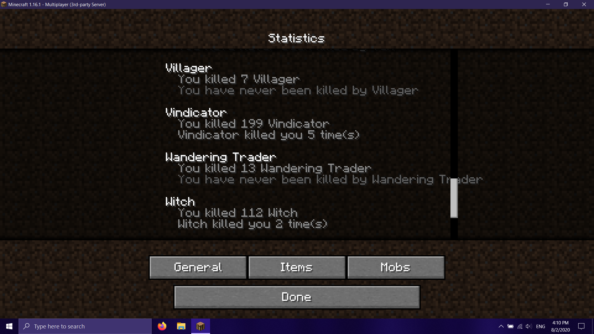 The text on the statistic page is to long on some of the "mobs" page. (See attached.) Notice that the wandering trader entry is visibly under the scroll bar.