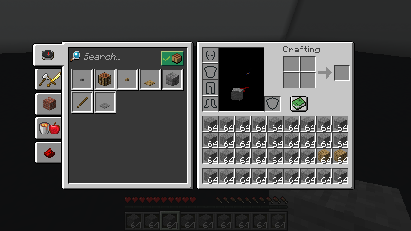 Open the player inventory. Have it so the Crafting Book/Guide is active and showing available crafting recipes (e.g. "Stone Button", "Crafting Table", "Oak Button", etc...).