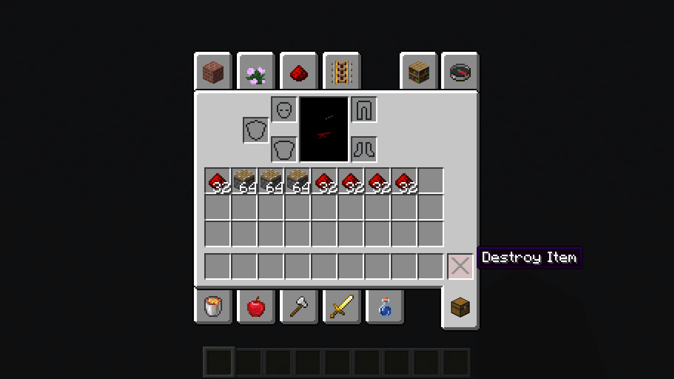 It should also be noted that, when creating the "Ghost Items", and attempting to /clear or delete all using [Shift]+[Clicking] "Destroy Item" in the creative inventory clears all loaded preset hotbar items and the very right-most item in the Inventory (as these are not "Ghost items").