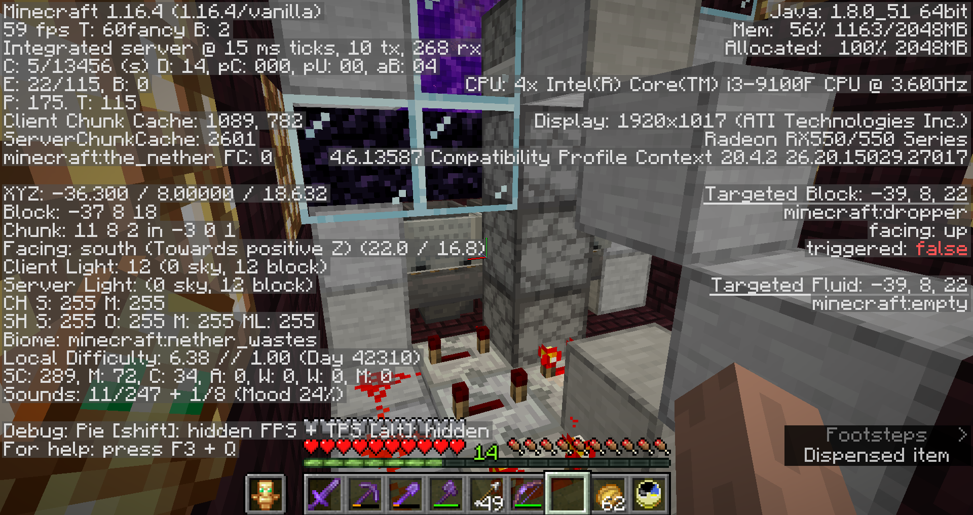 Attached are two screenshots of one of the exact locations where the crash has occurred (-38.50, 10.49, 23.51 in the Nether). One shows the block at that location (a Nether portal block). The other shows the redstone beneath, where hopper minecarts slurp up items that appear in the Nether portal and throw them back. This is a chunk loader.