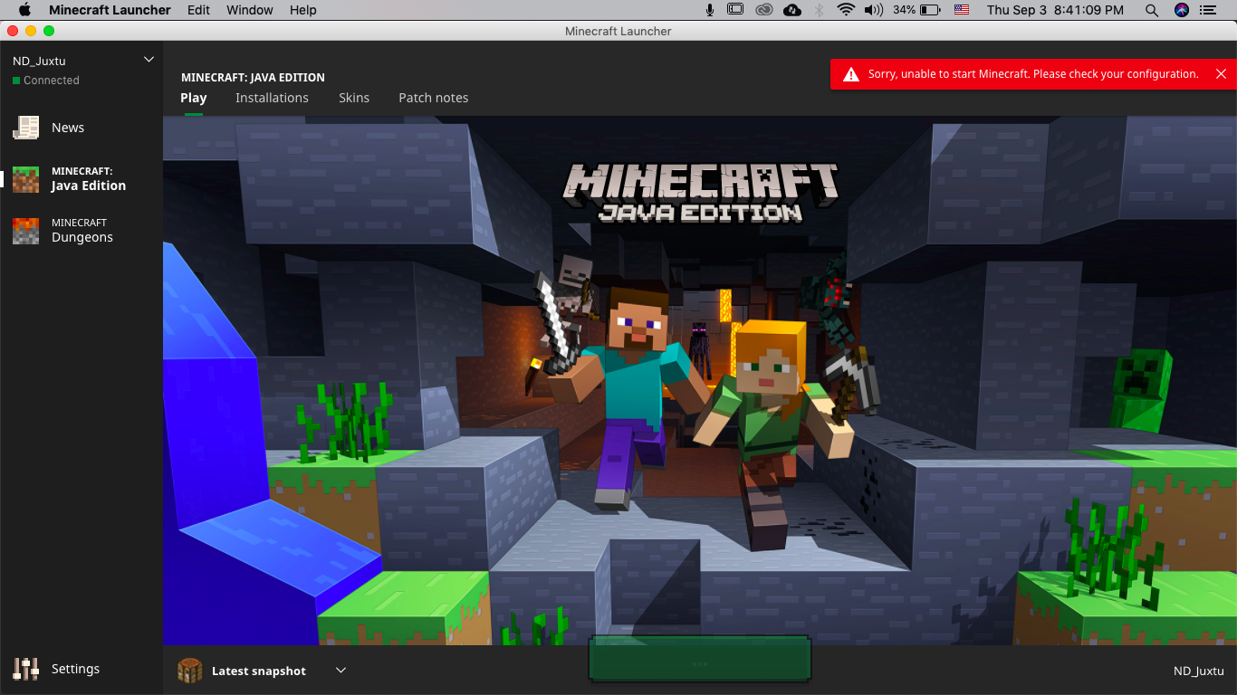 "Sorry, unable to start Minecraft. Please check your configuration."