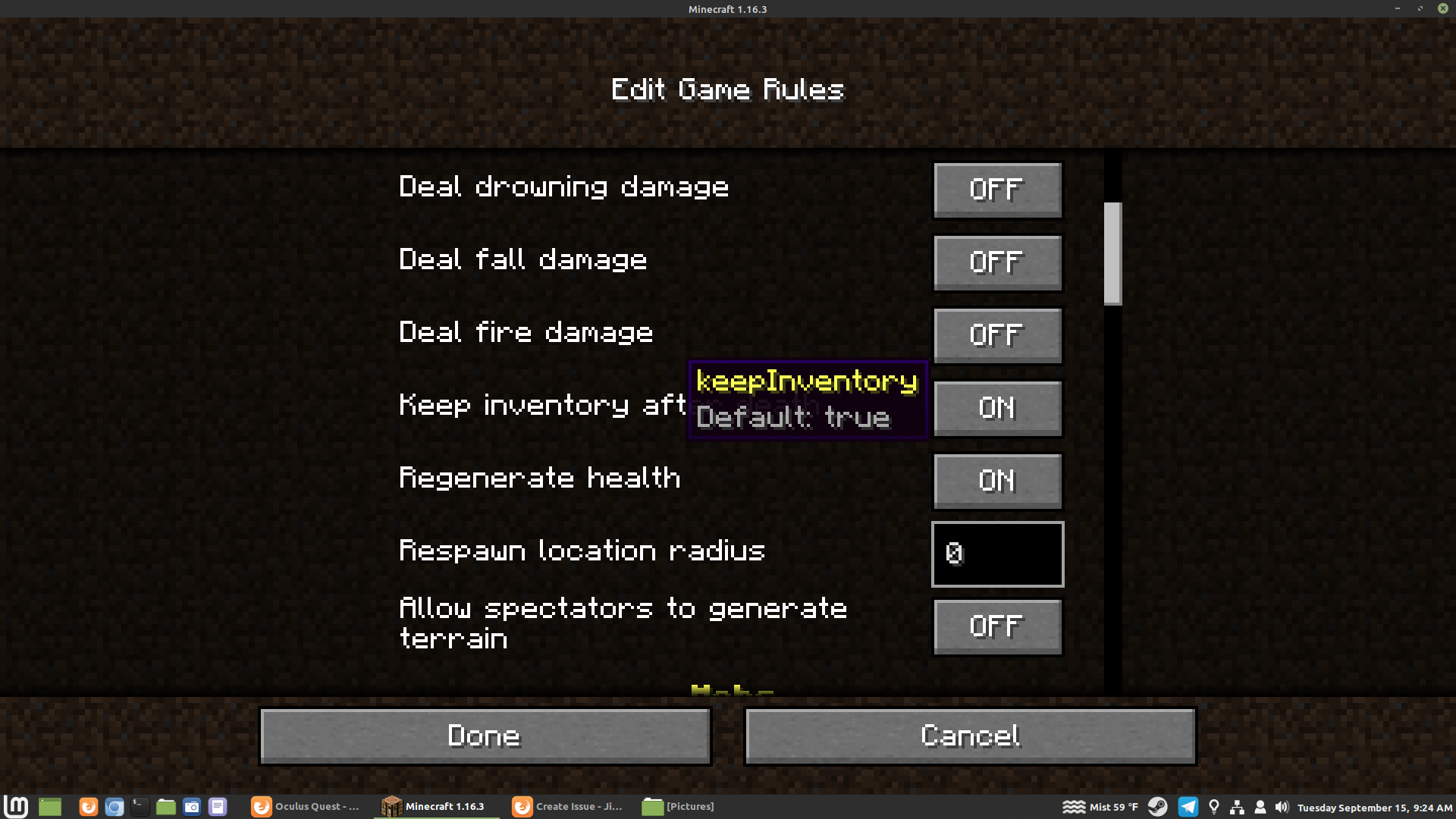 When creating a new world, and changing the rules in the Game Rules menu, if you hit Done after changing some, then go back into the Game Rules menu, the mouse-over tool-tip where it says "Default:" will now show the current setting, rather than the original default.