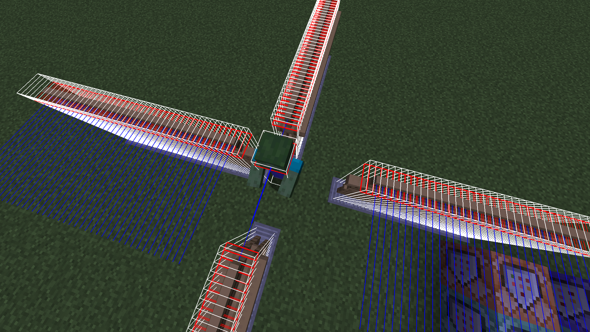 Running /execute as @e[type=zombie] at @s positioned ~-0.5 ~ ~-0.5 run kill @e[dx=1,dy=1,dz=1,type=armor_stand] produced a similarly distorted pattern, shown in screenshot four.