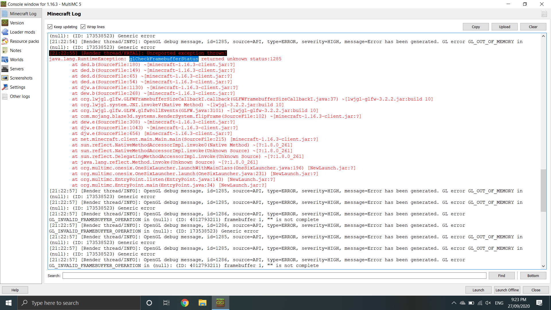 I just installed MC 1.16.3 via MultiMC on a new W10 laptop. It has an MX230 embedded graphics card. When I entered a realm, there was a random crash while I was looking around on the overworld while nobody else was online. The only settings I changed from the default were smooth lighting to minimum, FOV to 90, render distance to 12 chunks and graphics to fancy.