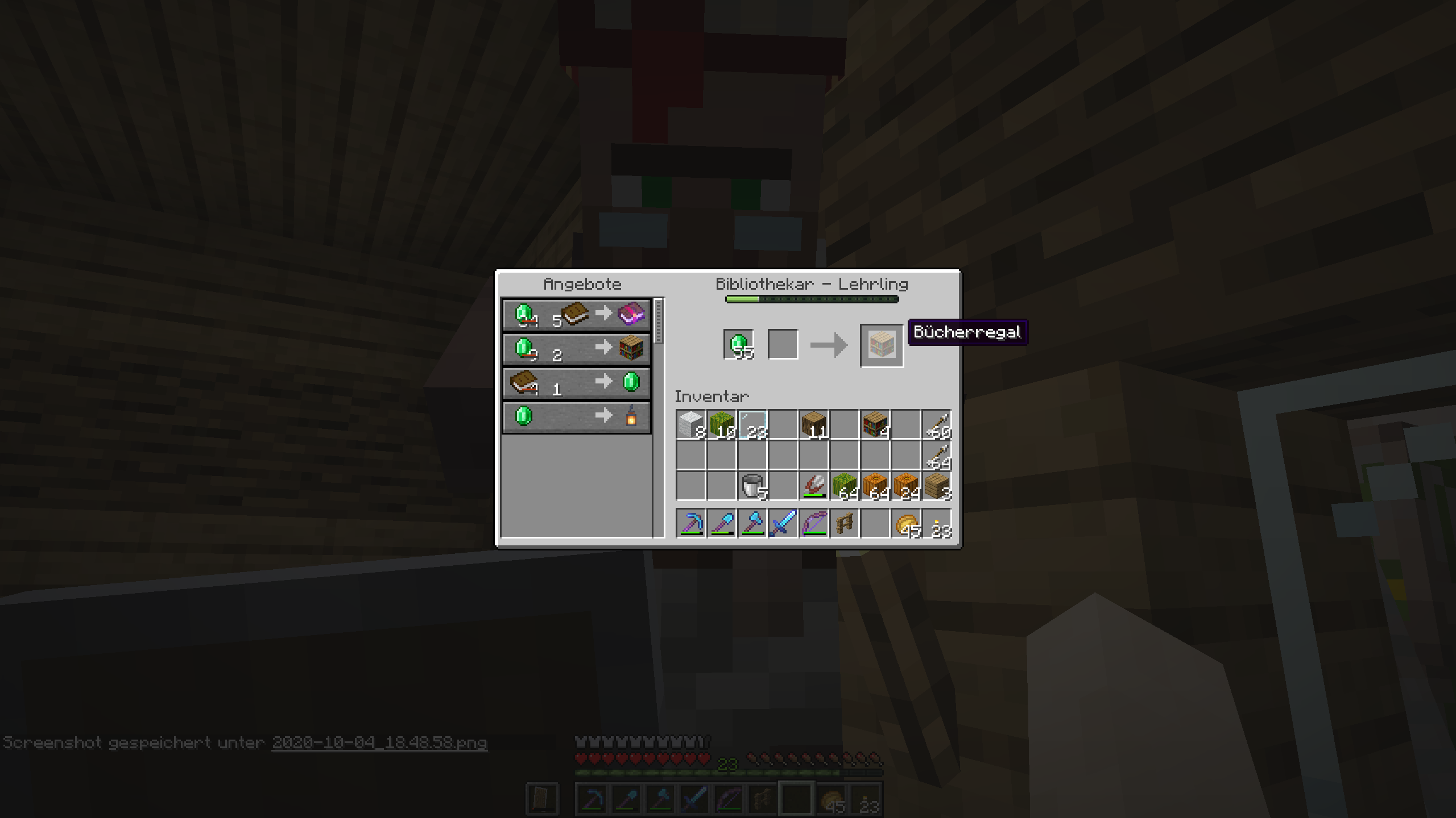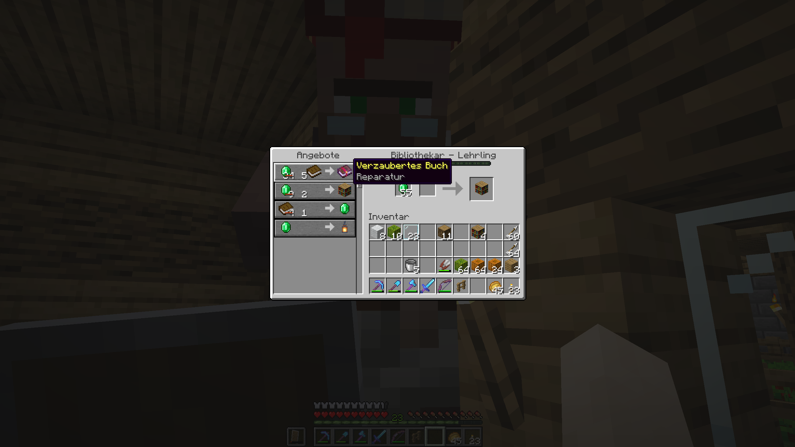 The librarian in my village has a book of mending as its first offer, which I traded six times. When I came back later to by more, I couldn't select the offer with mending. Everytime I tried to select the first offer, the second one (bookshelves) was being selected. As can be seen on the first screenshot, the librarian has an enchanted book in his hand when I select the desired trade. But in the trading GUI he instead offers bookshelves. When I complete a trade with the first offer, I get bookshelves and pay their price, instead of the price for the enchanted book.ย Furthermore the screenshots show, that the following offers (three and four) work as intended. Only the first offer is unselectable.