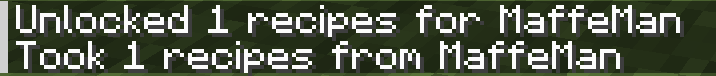 It's important to note that this issue doesn't only affect "commands.recipe.give.success.single" ("Unlocked %s recipes for %s") and "commands.recipe.take.success.single" ("Took %s recipes from %s"); this can also be seen with two other strings. I've listed all occurrences of this issue throughout the game's strings below.