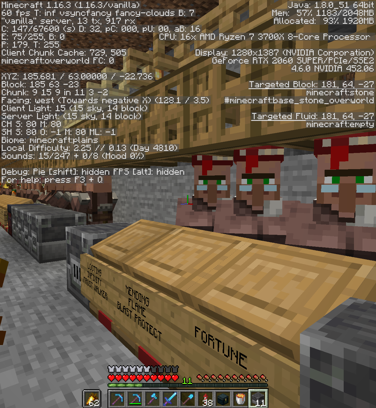 Please provide a screenshot of the trading hall with the F3 debug screen enabled.