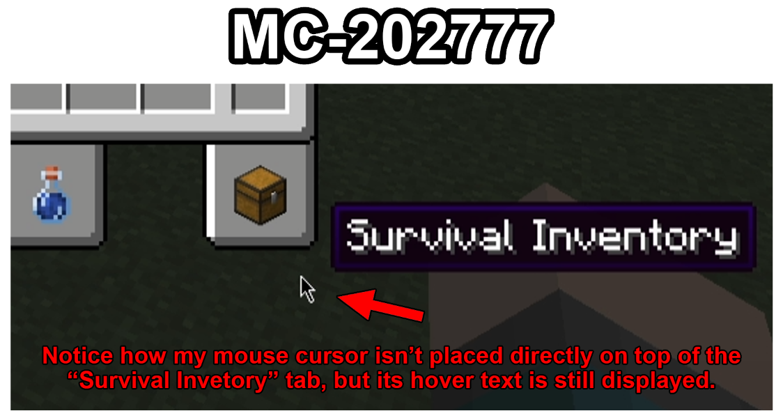 Tabs in the creative inventory would only display their hover text when the mouse cursor is positioned directly on top of them.
