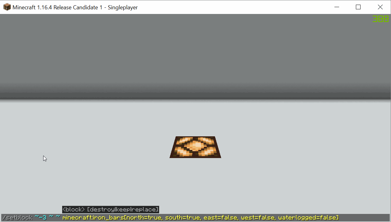 Command used in example - "/setblock ~-3 ~ ~ minecraft:{oak_fence/iron_bars/glass_pane}[north=true, south=true, east=false, west=false, waterlogged=false]"