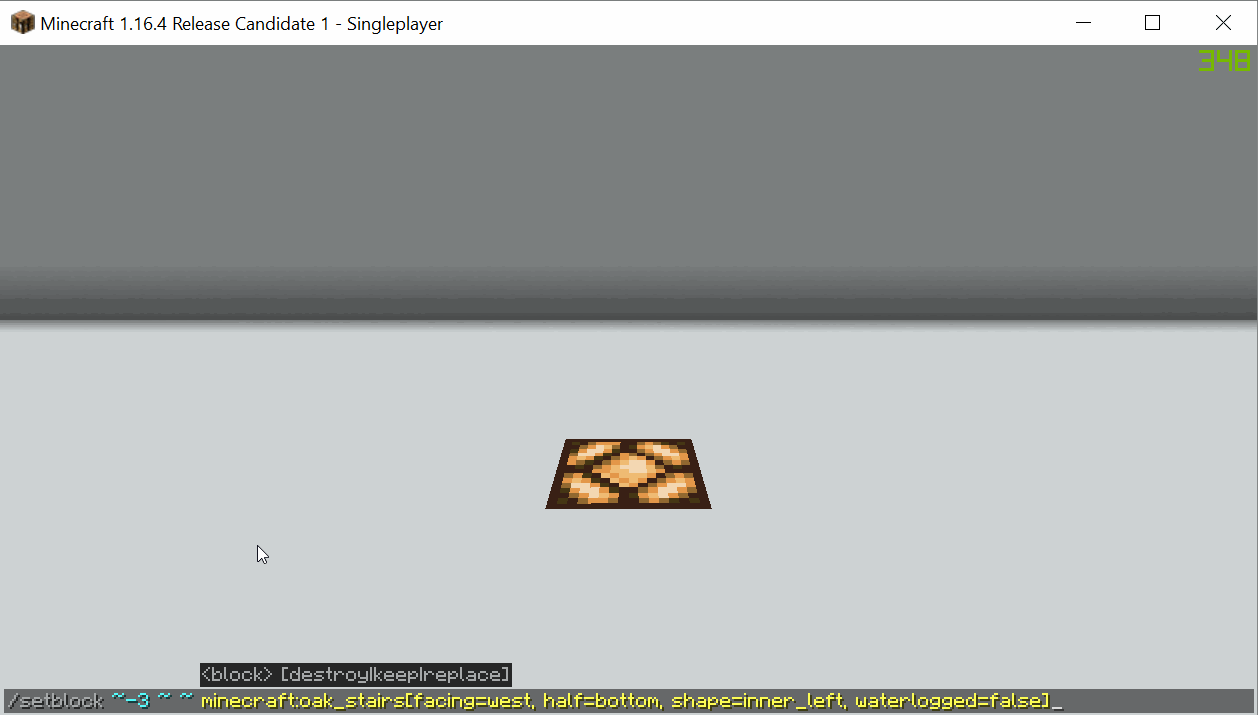 Command used in example - "/setblock ~-3 ~ ~ minecraft:oak_stairs[facing=west, half=bottom, shape=inner_left, waterlogged=false]"