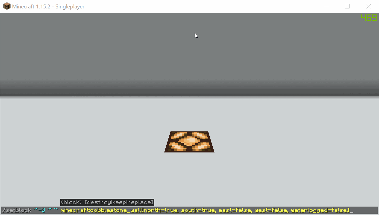 Command used in 1.15 example - "/setblock ~-3 ~ ~ minecraft:cobblestone_wall[north=true, south=true, east=false, west=false, waterlogged=false]"