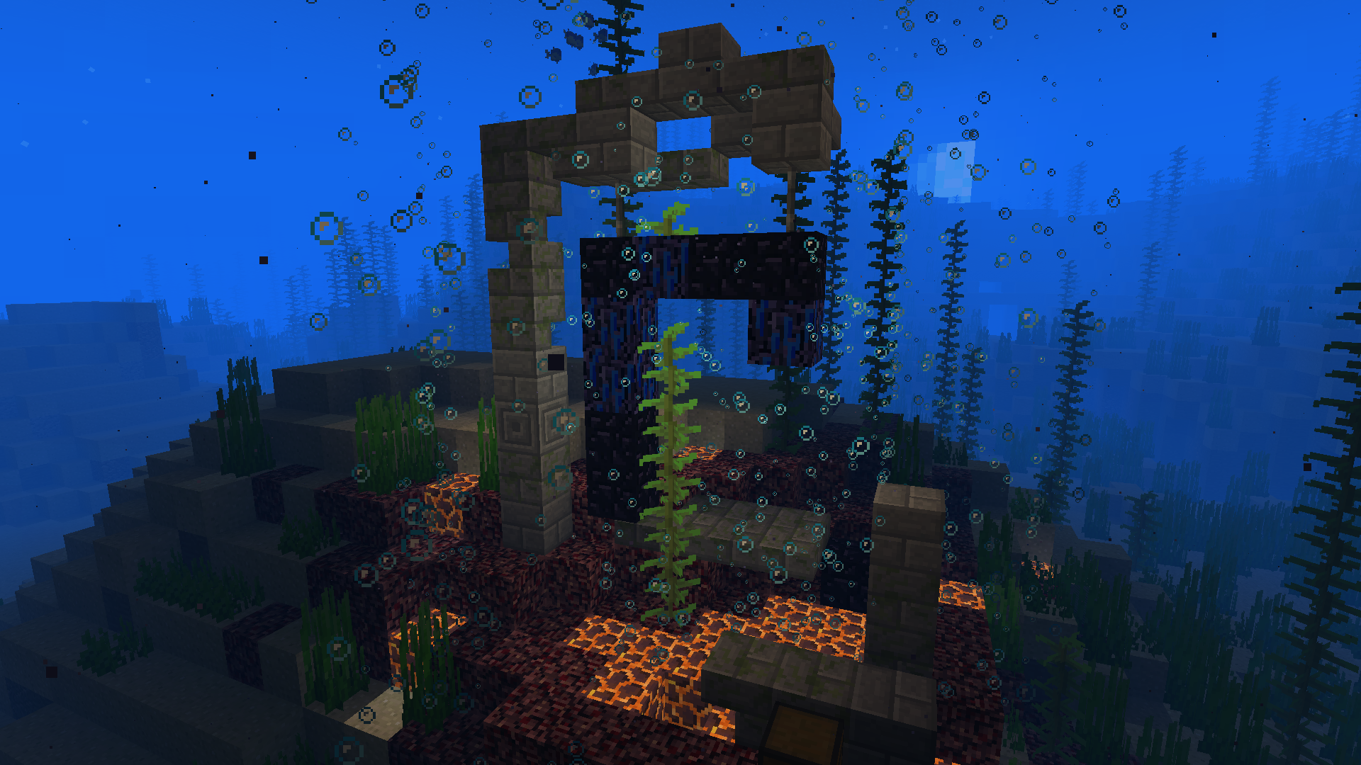 If a ruined portal generates underwater, I've seen Kelp plants that seem to have been "interupted by the portal, meaning one part of the plant has been replyced by Obsidian and it continued growing on top of that Onsidian.