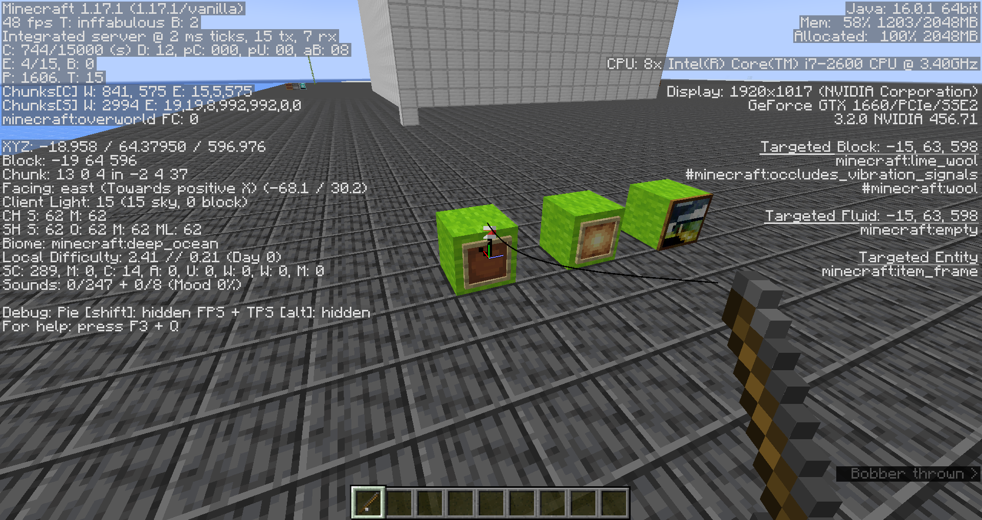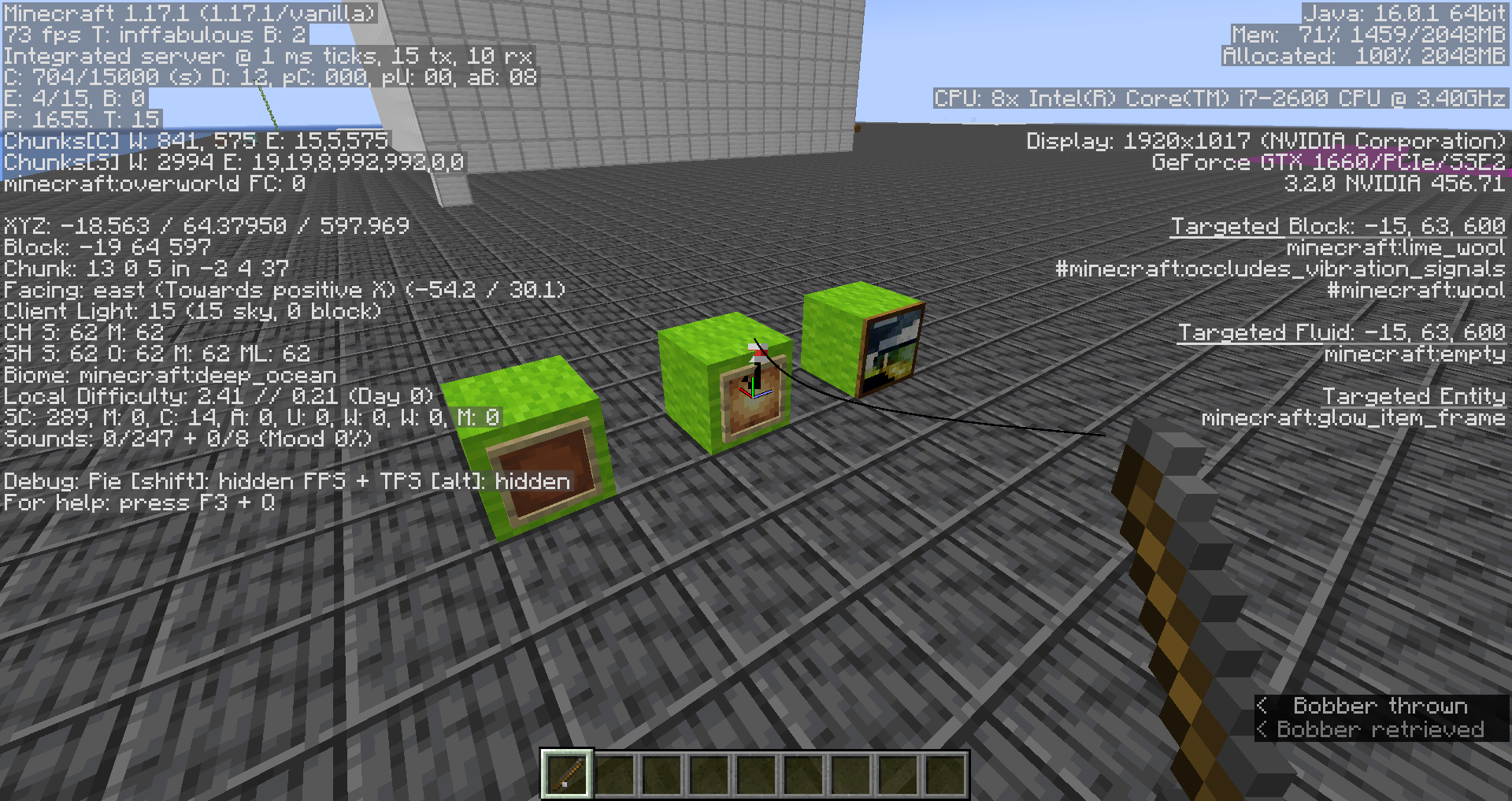 I noticed that the fishing rod strangely will attach to paintings, item frames, and leash knots. I do not think this is intentional.