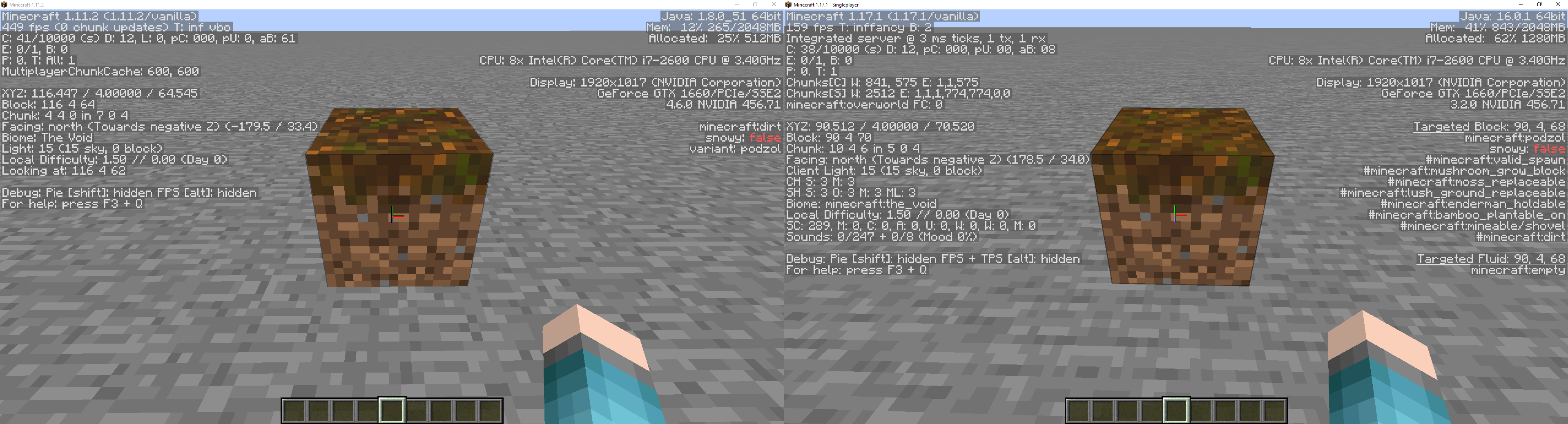 The side texture for podzol has not been changed in the texture update, resulting in a noisy texture, something that textures shouldn't have, based on how the purpur pillar did the same thing and was fixed.