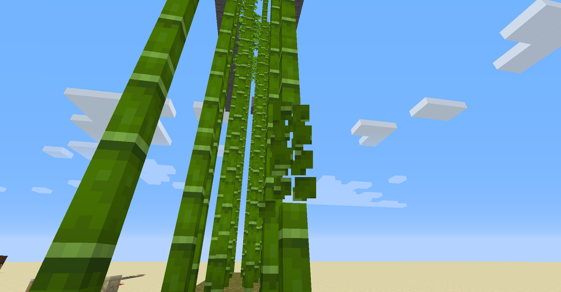 When you try to harvest bamboo, the bamboo stalk will not update correctly. The one bamboo stalk that you did harvest will take a few seconds to update itself, however it will not update the rest of the stalk. This is negated when you harvest the bottom stalk of bamboo. However, when you do this, the bamboo stalk will grow back instantly. This makes bamboo farms inefficient at the least, and non-functional at the worst.