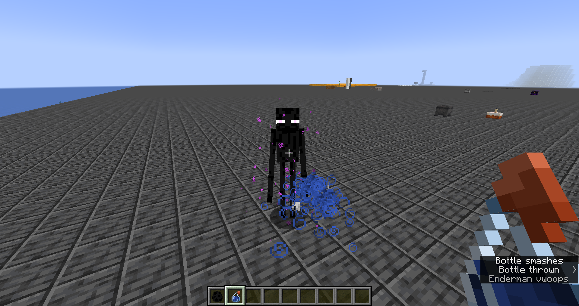 When throwing a splash potion of poison next to an enderman, the enderman still gets affected by the potion, but unlike splash water bottles and harming splash potions, the enderman does not teleport away from the area affect cloud.
