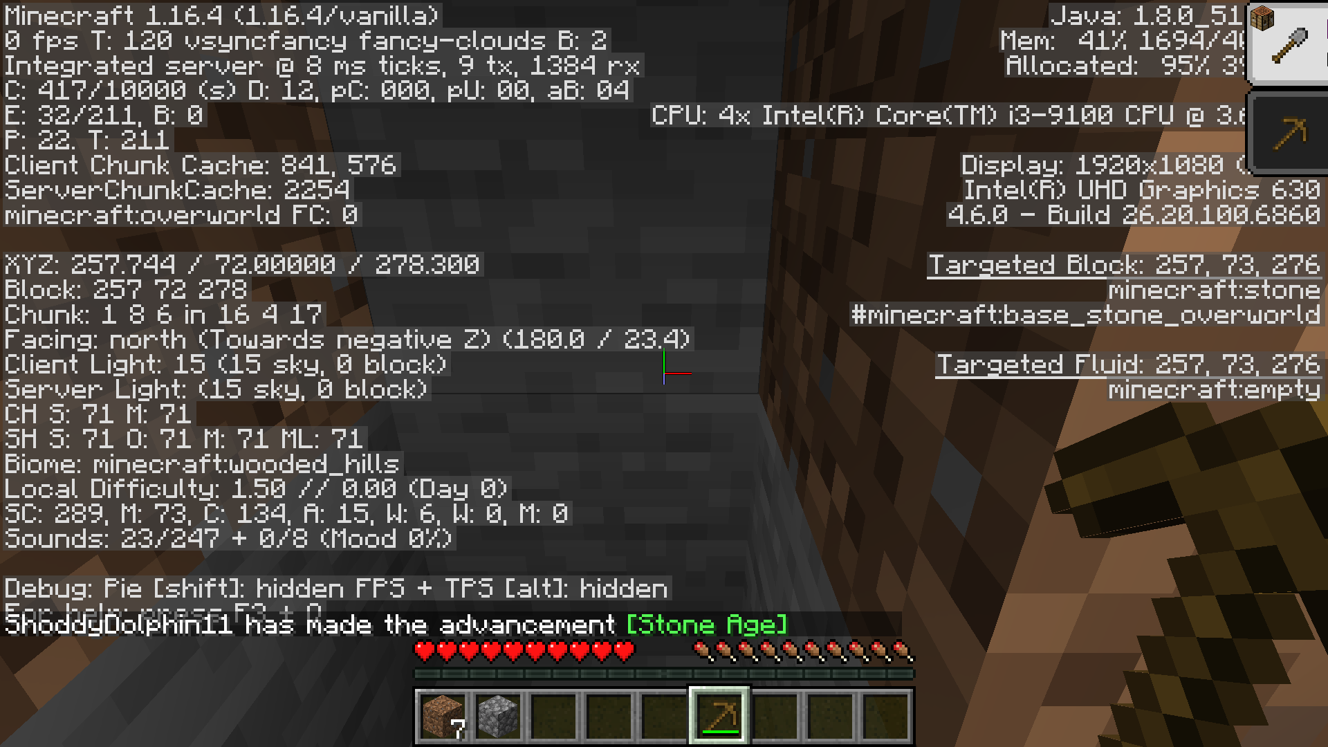 I'm not sure if this is considered as a bug, but when i start a world and mine some stone, the moment i picked the first cobblestone up minecraft freezes for a split second, it happens every game, i tried reducing the settings but nothing helped. Good news is that this happens only once per game, and it won't happen a second time in the same game/world. As you can see my fps has gone down to 0 in the attachment when i tried picking up a cobblestone.