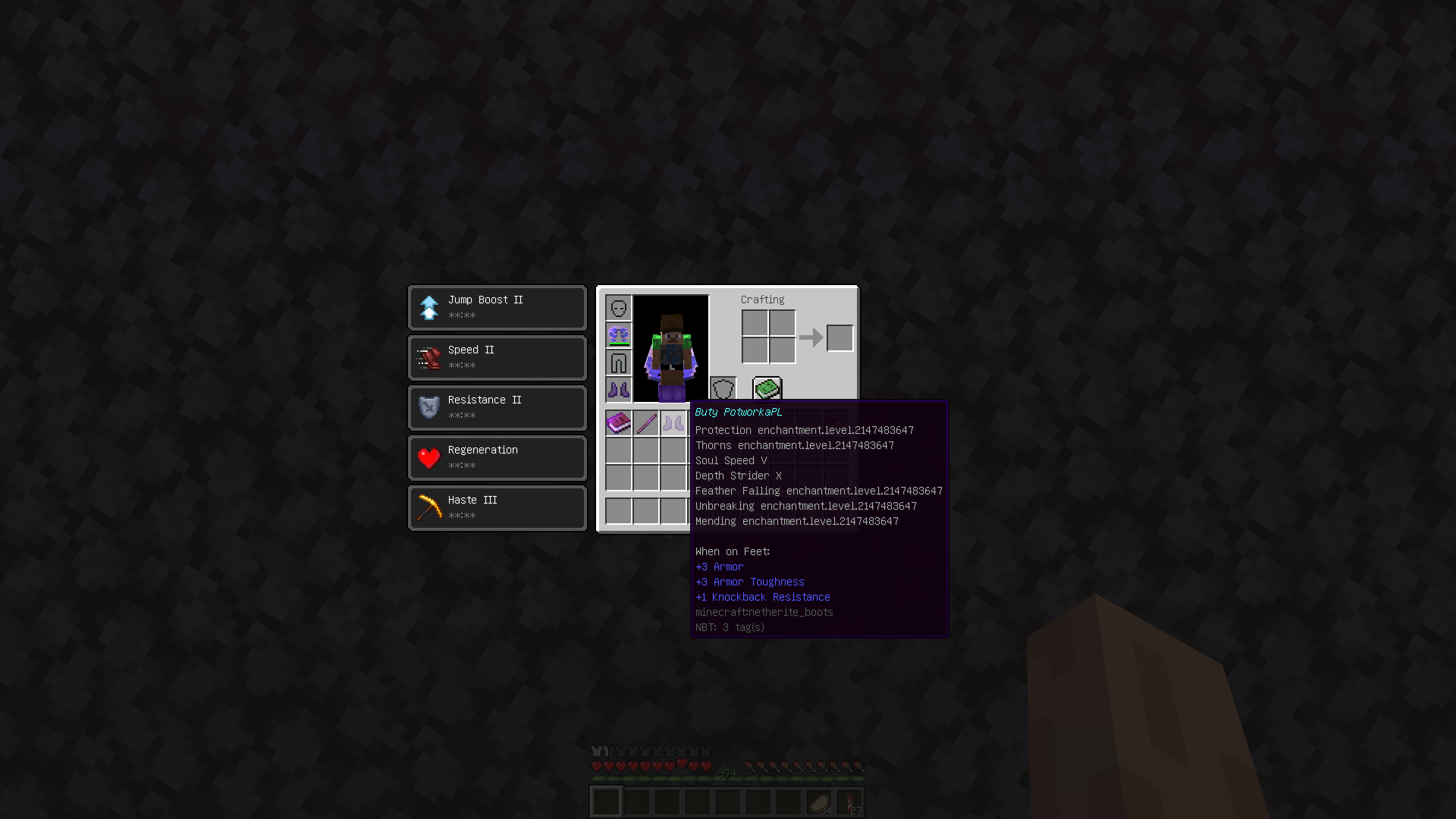 /give @p minecraft:netherite_boots{Enchantments:[{id:"minecraft:protection",lvl:2147483647,Count:1b},{id:"thorns",lvl:2147483647,Count:2b},{id:soul_speed,lvl:5,Count:3b},{id:depth_strider,lvl:10,Count:4b},{id:feather_falling,lvl:2147483647,Count:5b},{id:"unbreaking",lvl:2147483647,Count:6b},{id:"mending",lvl:2147483647,Count:7b}],display:{Name:'{"text":"Buty PotworkaPL"}'}} 1