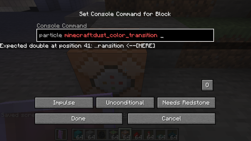 When trying to summon the particles mentioned in the title with commands, either in the command chat area or with a command block, the game doesn't recognize the particle name and can't summon them, even though it can with other particles (shown with angry_villager).