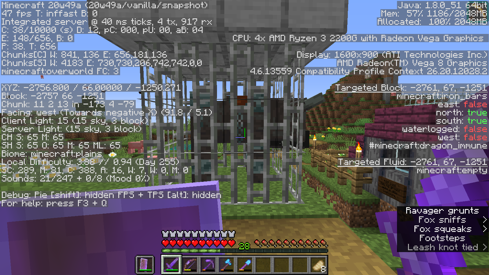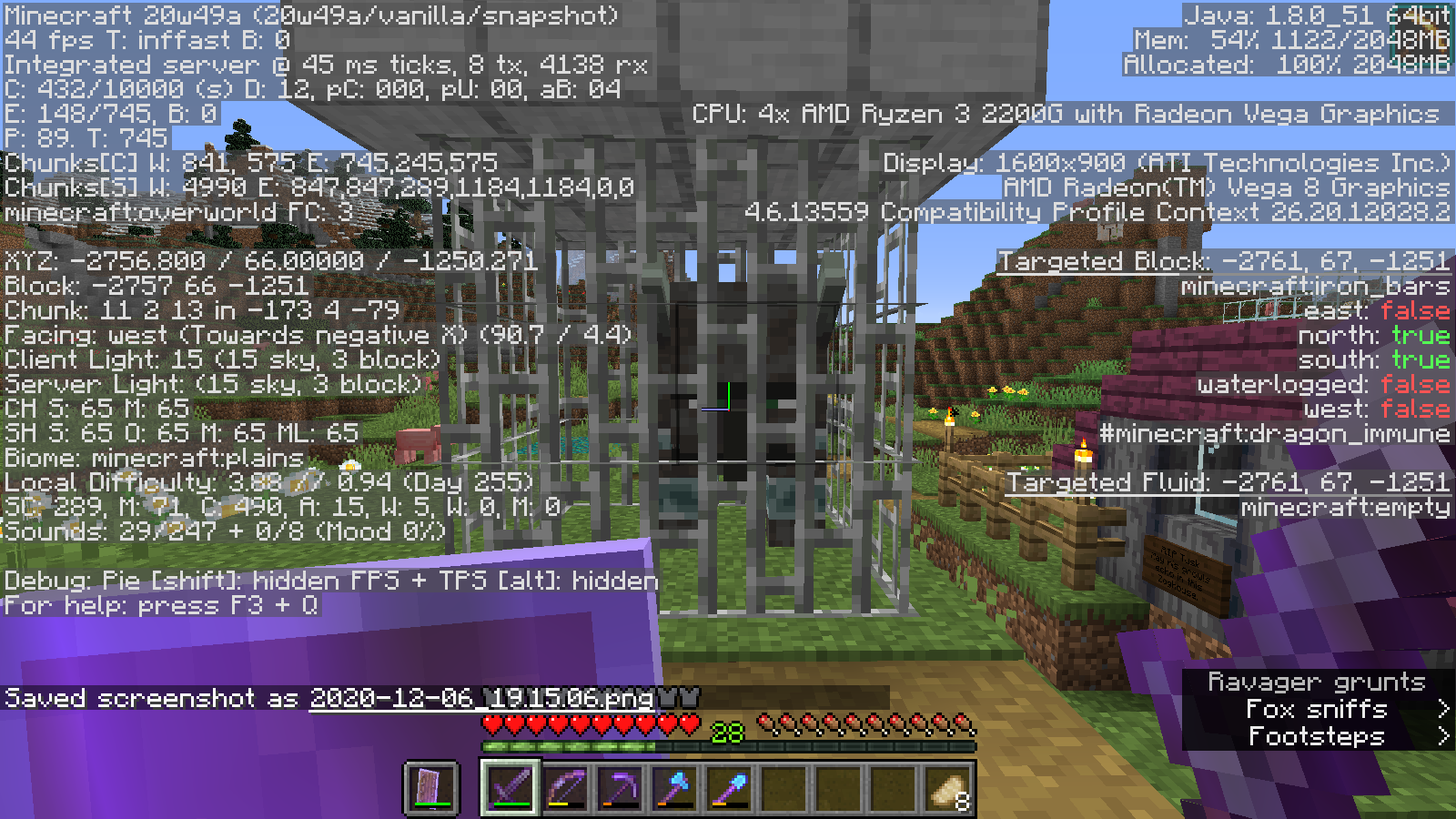 1. Build a 2x3x2 cage out of iron bars, with a roof made out of any solid block.