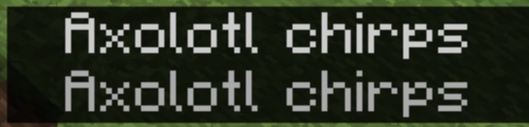 The two translation strings subtitles.entity.axolotl.idle_water and subtitles.entity.axolotl.idle_air both are translated as "Axolotl chirps" in en_US, but show up separately in the subtitles.