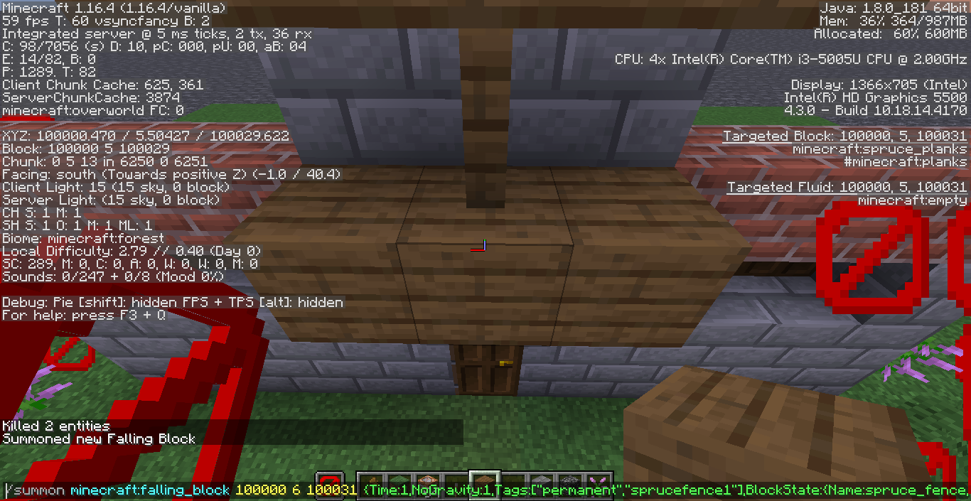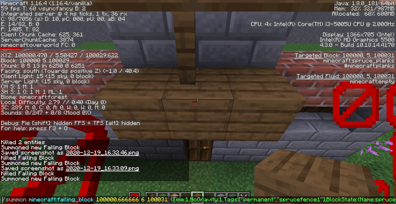 /summon minecraft:falling_block 100000.666666 6 100031 {Time:1,NoGravity:1,Tags:["permanent","sprucefence1"],BlockState:{Name:spruce_fence,Properties: