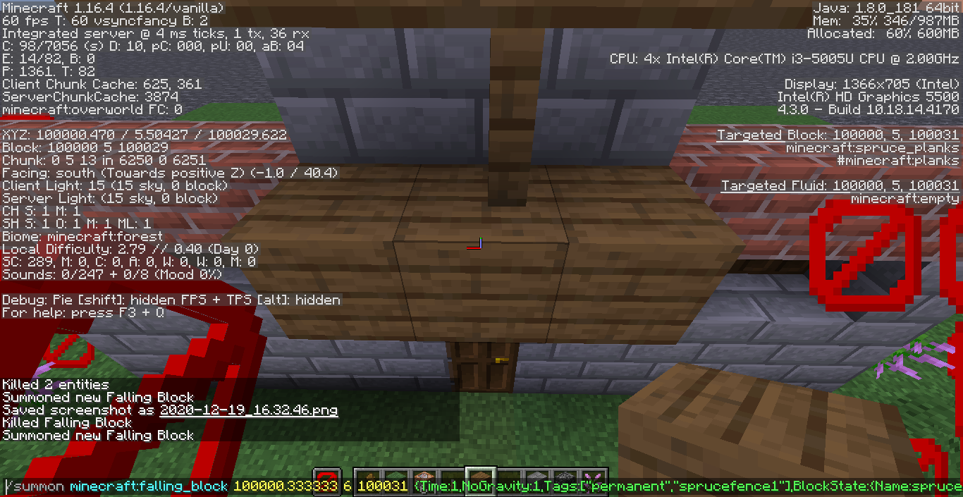 /summon minecraft:falling_block 100000.333333 6 100031 {Time:1,NoGravity:1,Tags:["permanent","sprucefence1"],BlockState:{Name:spruce_fence,Properties: