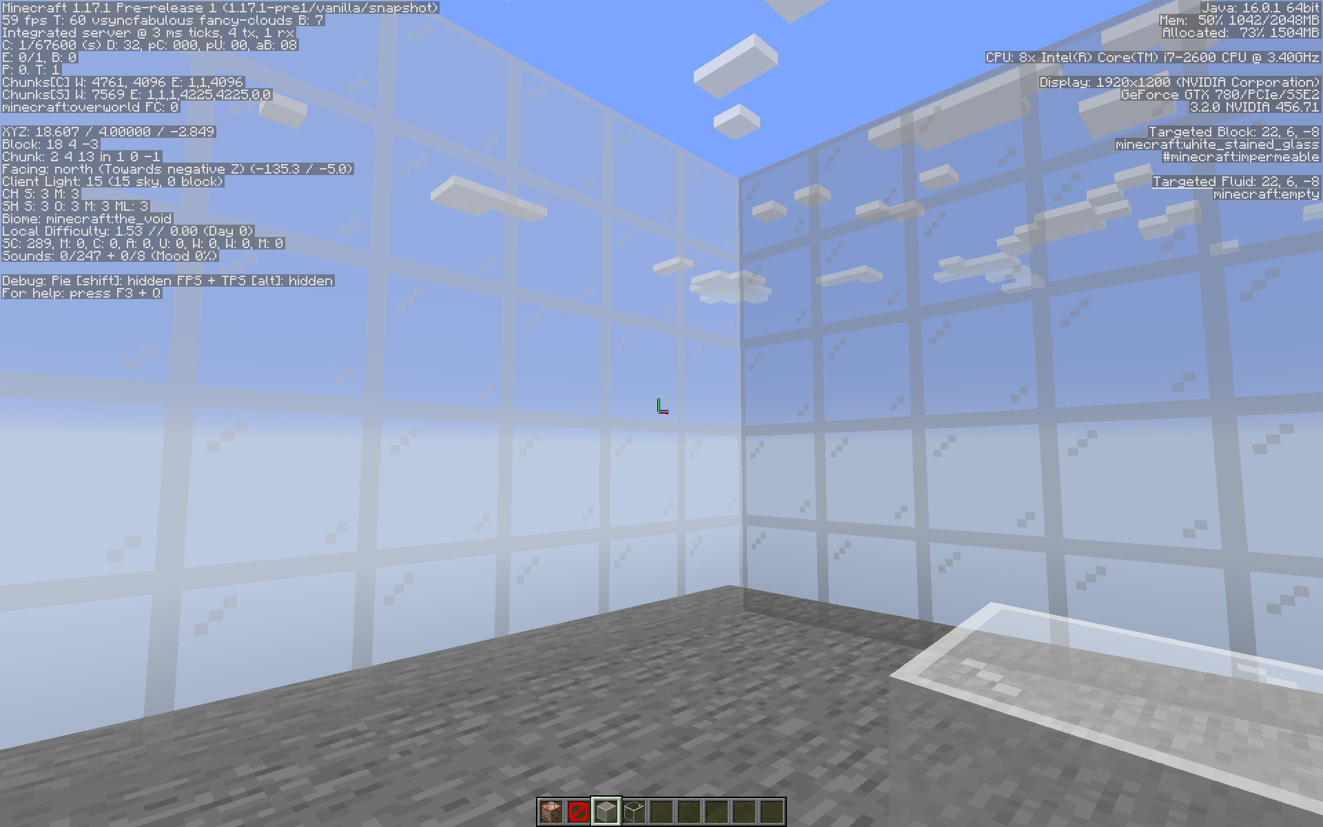 Graphics: Fancy; Smooth Lighting: max; VSync: On; View Bobbing: on; Brightness: Bright;